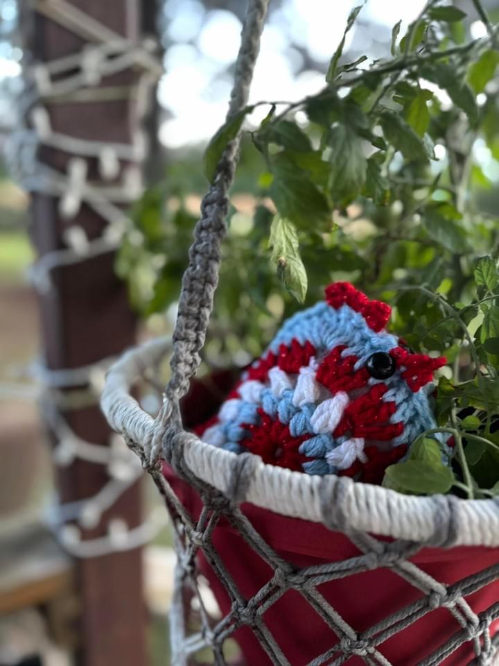This little crochet bird is a charming example of "amigurumi" (the Japanese art of knitting or crocheting small, stuffed yarn creatures).